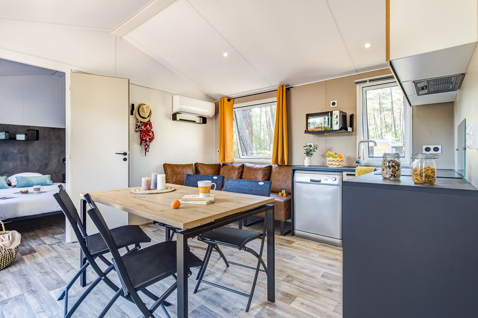 De Cottage Cocoon is een premium stacaravan van 40 m² met een warm en modern interieur. De accommodatie beschikt over drie aparte slaapkamers en twee badkamers en biedt plaats aan maximaal zes gasten. Dankzij de omkeerbare airconditioning en televisie is comfort het hele jaar door gegarandeerd. Huisdieren zijn toegestaan, ideaal voor gezinsvakanties.