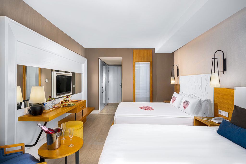 Zomer Wanneer je tussen 01-04-2026 en 26-11-2026 in deze accommodatie verblijft, is onderstaande informatie van toepassing. * Ligging * Privéstrand * Ligbedden met matrasjes * Parasol * Dichtstbijzijnde winkel op circa 750 meter * Dichtstbijzijnde restaurant op circa 300 meter * Dichtstbijzijnde bar op circa 300 meter * Manavgat op circa 23 kilometer * Alanya op circa 33 kilometer * Bushalte op circa 500 meter * Algemeen & faciliteiten * 1 gebouw * Maximaal 5 verdiepingen * 410 kamers * Receptie * 24 uur per dag * Lobby * 4 liften * Bagageruimte * Wifi in alle openbare ruimtes * Meerdere winkels * Minimarkt * Wasservice tegen betaling * Doktersservice tegen betaling * Tuin * Openbare parkeergelegenheid * Privé parkeergelegenheid * Restaurants & bars * Buffetrestaurant * 5 à-la-carterestaurants * Aziatisch restaurant * Italiaans restaurant * Mexicaans restaurant * Turks restaurant * Visrestaurant * Snackbar * Patisserie * 6 drinkgelegenheden * Bar * Beachbar * Discobar * Koffiecorner * Lobbybar * Poolbar * Activiteiten & ontspanning * Aerobics * Beachvoetbal * Biljart * Boccia * Boogschieten * Bowling * Darts * Fitness * Tafeltennis * Watersporten tegen betaling * Yoga * Spa Center * Binnenzwembad * Sauna * Hamam * Bubbelbad buiten * Massages tegen betaling * Schoonheidsbehandelingen tegen betaling * Gameroom * Animatie voor kinderen * Shows * Livemuziek * Zwembaden * 3 buitenzwembaden * Eén van deze zwembaden heeft 4 glijbanen * Buitenzwembad voor kinderen * Binnenzwembad * Verwarmd * Zonneterras * Ligbedden met matrasjes * Parasol * Badhanddoekenservice * Kinderfaciliteiten * Mini club (4-12 jaar) * 7 keer per week in het hoogseizoen * Teenage club (13-16 jaar) * 7 keer per week in het hoogseizoen * Minidisco * Buitenspeeltuin * Babybedje op aanvraag via ons contact center * Verzorging * Ultra All Inclusive * Ontbijt in buffetvorm (07.00-10.00 uur) * Laat ontbijt in buffetvorm (10.00-10.30 uur) * Lunch in buffetvorm (12.30-14.30 uur) * Diner in buffetvorm (18.30-21.30 uur) * Dineren in alle à-la-carterestaurants * Snacks (12.00-16.00 uur) * Koffie, thee & koekjes * IJs (24 uur per dag) * Middernachtsnack (02.00-07.00 uur) * Selectie lokale (non-)alcoholische drankjes (24 uur per dag) * Tegen betaling: import drankjesHotelkamers * 2-persoonskamer Standaard Landzicht DZL * 2-persoonskamer Standaard Zijzeezicht DZI * Oppervlakte van circa 29 m² * Zijzeezicht * Airconditioning * Kluisje * Televisie * Telefoon tegen betaling * Eet- en drinkfaciliteiten * Koffie- en theefaciliteiten * Minibar * Badkamer douche, toilet, föhn, badjassen en badslippers * Wifi * Balkon (zitje) * 2-persoonskamer Standaard Zeezicht DZM * Oppervlakte van circa 29 m² * Zeezicht * Airconditioning * Kluisje * Televisie * Telefoon tegen betaling * Eet- en drinkfaciliteiten * Koffie- en theefaciliteiten * Minibar * Badkamer douche, toilet, föhn, badjassen en badslippers * Wifi * Balkon (zitje) * 2-persoonskamer Superior Landzicht (2+2) DSL * Oppervlakte van circa 34 m² * Landzicht * Airconditioning * Kluisje * Televisie * Telefoon tegen betaling * Eet- en drinkfaciliteiten * Koffie- en theefaciliteiten * Minibar * Badkamer douche, toilet, föhn, badjassen en badslippers * Wifi * Balkon (zitje) * 2-persoonskamer Terras (Whirlpool sea view) DT2 * 2-persoonskamer Terras Zijzeezicht (Whirlpool side sea view) DT1 * Familiekamer Standaard (2+1/2+2/2+3/3+1/3+2) FZ2 * Familiekamer Connection (2+2/2+3/3+1/3+2/4/4+1) FK1 * Twee standaardkamers met tussendeur * Airconditioning * Kluisje * Televisie * Telefoon tegen betaling * Eet- en drinkfaciliteiten * Koffie- en theefaciliteiten * Minibar * Badkamer douche, toilet, föhn, badjassen en badslippers * Wifi * Balkon (zitje)